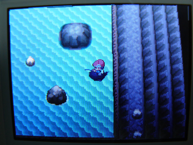 爆釣ポイントは縦に長いこの湖を上下に4分割したブロックに各1カ所という話を聞いたので下から8列をボロのつりざおで各マス3回釣り上げては移動というやり方で